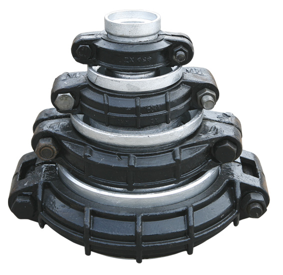 卡箍式柔性管接头与传统的法兰盘相比,具有设计合理,技术性能好,使用安全可靠,社会效益高等特点。该产品体积小、重量轻、结构简单,每套管接头只有2-4个(大口径除外)螺栓,安装维修方便,在安装时可以随意选定操作方便的地方操作,与法兰盘相比提高工效5-8倍,不仅减少了安装强度,而且为延长管道寿命提供了确切的保证,故又称快速接头;两连接管子之前为柔性连接,允许3-5度任意偏移,在稍有起伏、弯曲的地面或巷道的管路中,可不必另取角度弯头,由于两管之间具有间隙,可自行补偿钢管伸缩,管路全程可取消伸缩补偿器,使工程造价降低;柔性密封圈具有自紧密封功能,它与传统的法兰盘相反,介质压力越高,密封性能越好,而且耐冲击、耐震动,保证了密封可靠性。由于该产品集上述之优点,现已被电力、煤碳、冶金、化工等设计部门所重视和选用,远销国内十几个省市的电力、煤碳、冶金、化工等部门,深受用户欢迎。