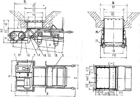 1、减速机 2、电动机 3、传动平台 4、联轴器 5、H形架 6、连杆 7、给煤槽 8、闸门 9、机架 10、漏斗 11、托辊