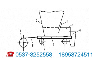 它主要由偏心机构1、斜板2、往复板3、调节板4、侧板5、溜槽6、滚轮7及连杆8等组成。作往复运动的往复板3支承在滚轮7上面、往复板3的往复运动是靠偏心机构1通过连杆8来实现的;往复板的两侧有侧板5,后面有斜板2,形成固定的槽壁。当往复板向前运动时,往复板上的物料借助于摩擦力的作用也随着前进,往复板后面的空间就被煤仓中落下的煤所填满。往复板后退时,煤被斜板挡住,不能随着后退。这样,往复板前端的煤就被卸到溜槽中。往复板重复地连续动作,煤就被一段一段地卸下。这种给料机可以通过调节闸板4和偏心机构1来调节物料的流量。往复式给料机多用于煤仓下。