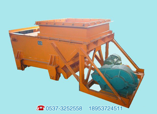 底板的两则有侧板,后面有斜板形成固定的槽壁。当底板向前运动时,底板上的物料借助于摩擦力的作用也随之前进,底板后面的空间就被煤仓中落下的煤所填满,底板后退时,被斜板挡住不能随之后退,这样底板前面的煤就被卸下,底板连续往复动作,煤就被一段一段地均匀地卸到运输机或其他筛选设备上。