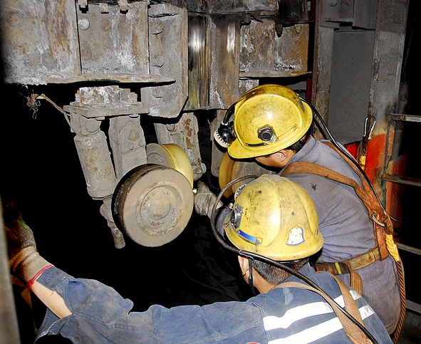 改进方法:为便于安装,不改变罐耳座在罐笼上的安装尺寸,将原罐耳座开口处的斜面改成平面,并在其两侧平面上分别钻2个深为17mm的M12的螺孔,并且增设一个罐耳压盖,用4个M12×25的螺栓把压盖紧固在罐耳座上。为保证压盖能压紧罐耳衬套,安装后的罐耳压盖台阶处与罐耳座两侧平面之间应留有1~2mm的间隙。为防止罐耳压盖松动,M12的螺栓应加弹簧垫圈或其他防松措施。