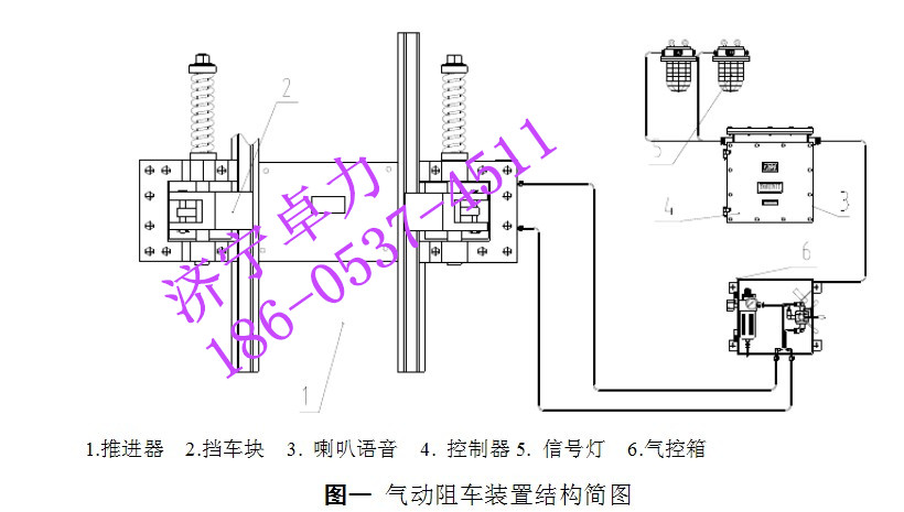 本装置由挡车器、推进器、控制器、灯光信号、语音喇叭、气控箱等几部分组成。