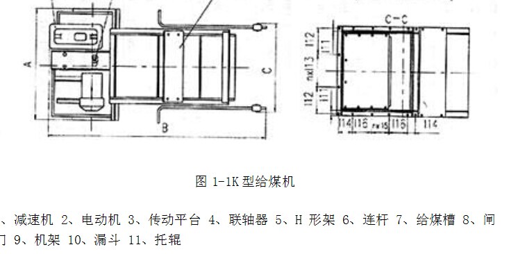该机主要由电动机、减速器、曲拐、底托板、底托轮、后斜板、侧板、弧形门、煤仓缩口联接盘等组成。主要技术参数为:电动机功率:18.5kW;给煤量:132、268、395、530Ch。 该机使用中主要存在以下问题: